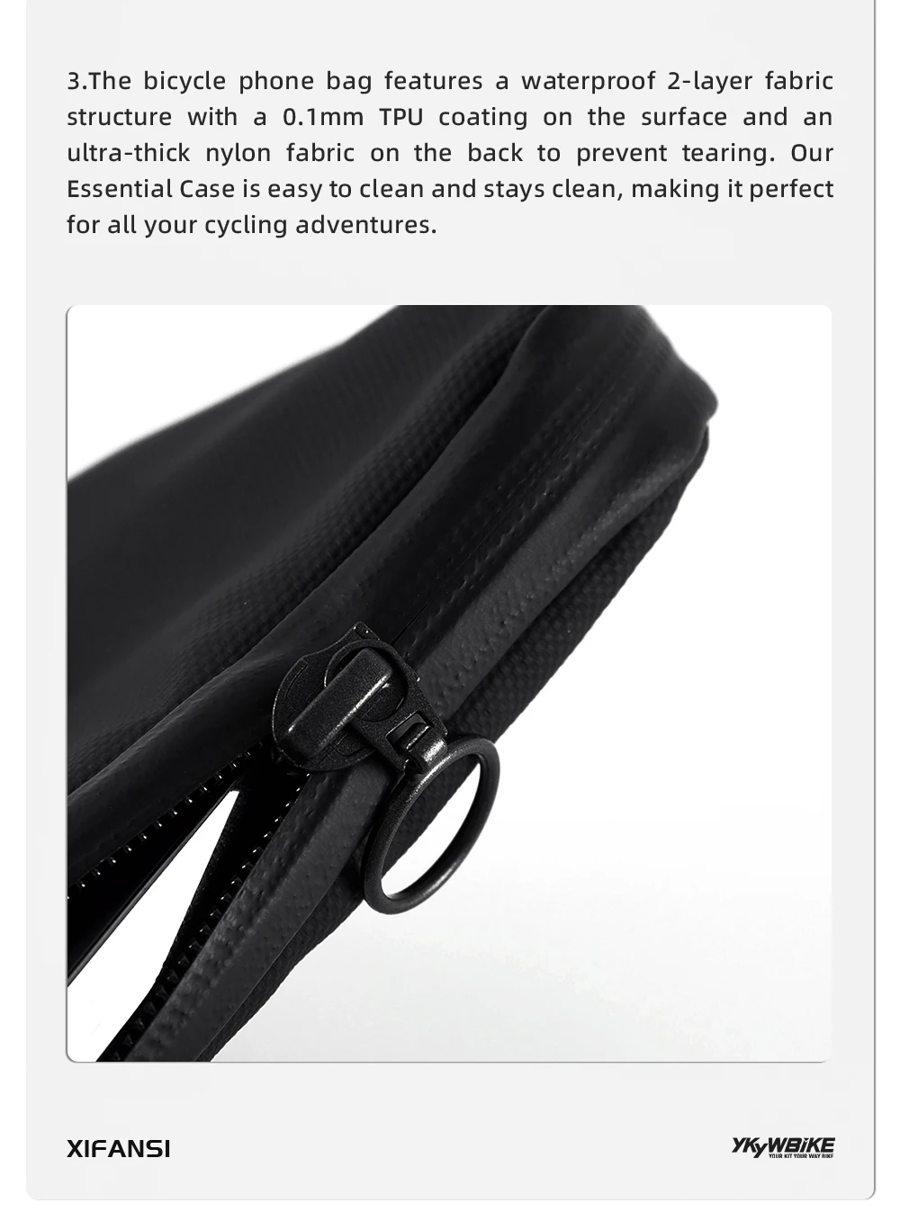 3.The bicycle phone bag features a waterproof 2-layer fabric structure with a 0.1mm TPU coating on the surface and an ultra-thick nylon fabric on the back to prevent tearing. Our Essential Case is easy to clean and stays clean, making it perfect for all your cycling adventures.