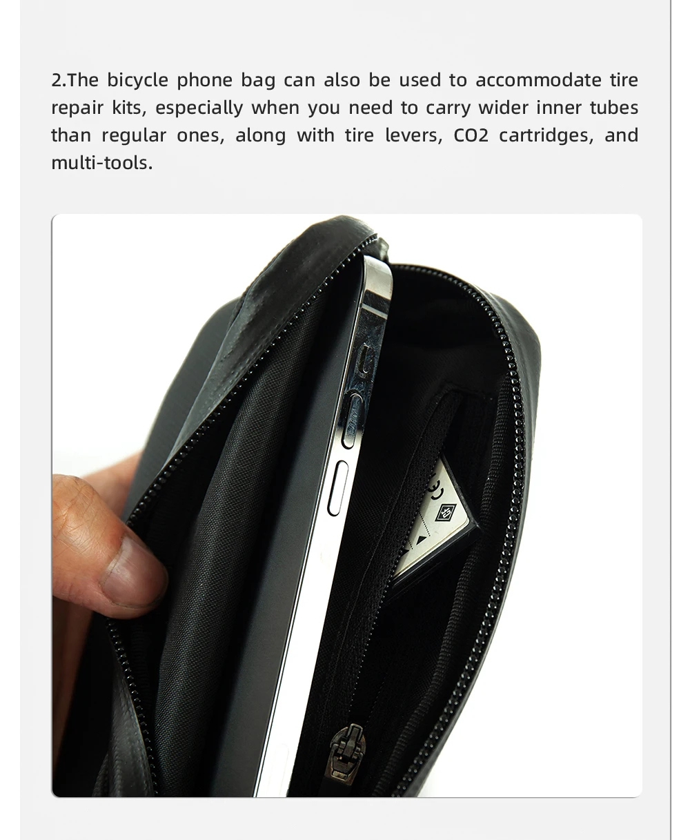 2.The bicycle phone bag can also be used to accommodate tire repair kits, especially when you need to carry wider inner tubes than regular ones, along with tire levers, CO2 cartridges, and multi-tools.